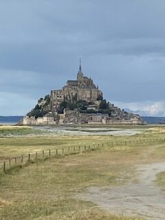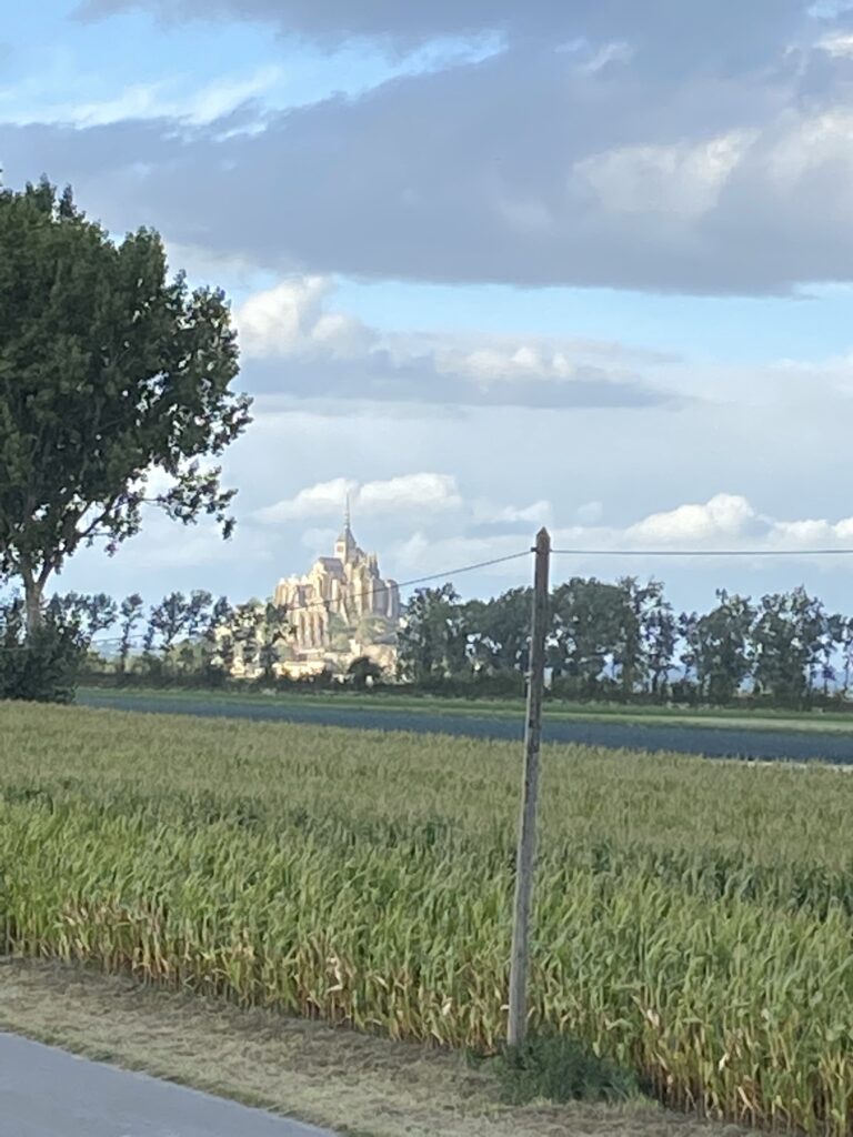 Nächster Tag Fahrt zum Mont St. Michel. Des besseren Blicks wegen Annäherung unter Protest von Gudrun auf Feldwegen. Schon von Weitem ein beeindruckender Anblick. Wir hatten dazu das Glück, den Mont und das Kloster bei ringsum wolkenverhangenem, schwarzen Himmel minutenlang durch eine Wolkenlücke von der bereits tiefstehenden Sonne angestrahlt zu sehen – ein tolles Bild!